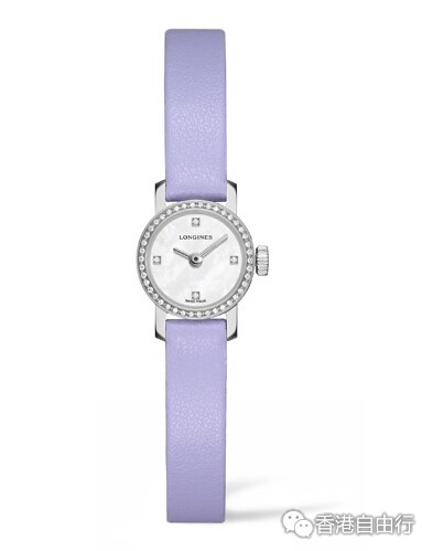 浪琴表袖珍系列腕表搭载L298.2石英机芯,白色珍珠贝母表盘上饰有四个钻石时标与银色镀铑指针。每款时计的表圈上都镶嵌钻石,从而成就实至名归的珠宝腕表。该款时计配备淡紫色皮质表带。