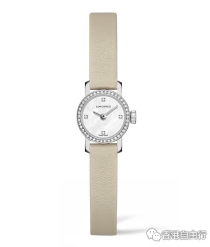 浪琴表袖珍系列腕表搭载L298.2石英机芯,白色珍珠贝母表盘上饰有四个钻石时标与银色镀铑指针。每款时计的表圈上都镶嵌钻石,从而成就实至名归的珠宝腕表。该款时计配备米黄色皮质表带。