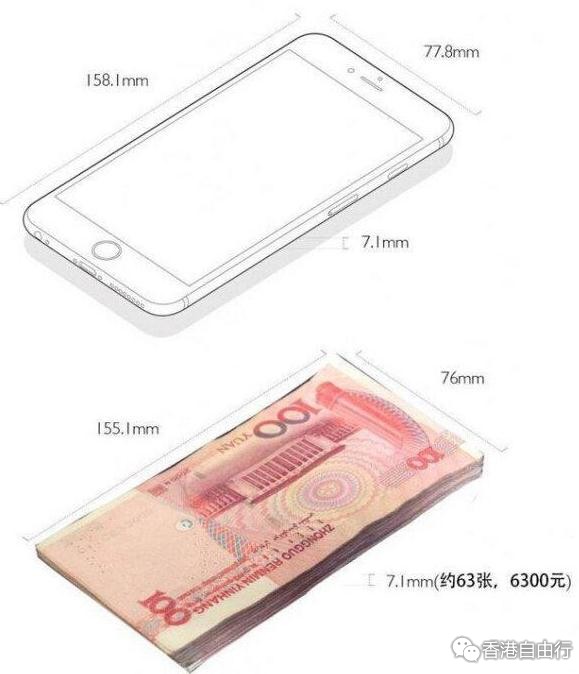 iPhone 6plus和人民币的100元钞票大小几乎一致,别着急,还有更惊人的,63张百元钞票的厚度和iPhone6Plus厚度都是7.1mm。是不是很神奇?