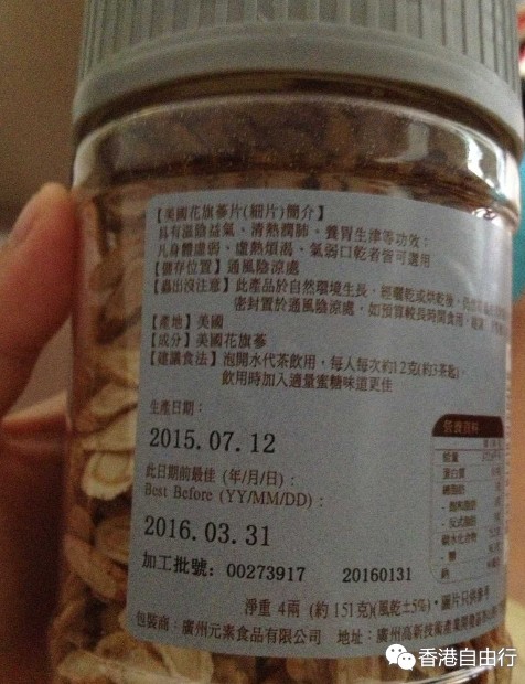 楼上美国花旗参小片特价,169港币一罐,也是4两约151g,比10罐7折划算太多,一个会员活动期间只能买四罐,或者打印优惠券一次可以买4罐,生产日期15年7月12日,很新鲜